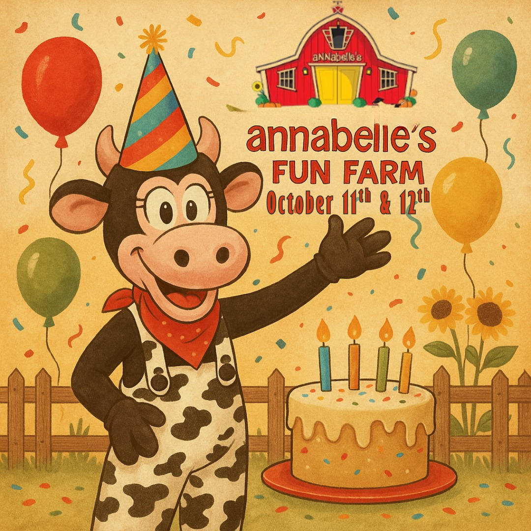 Join us as we celebrate Annabelle's 15th birthday in style! We're kicking off the fun with an 8-foot inflatable birthday cake and lots of surprises scattered all over the farm. Come celebrate with us and enjoy all your fall favorites!